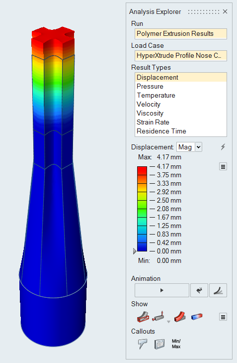 Displacement | The displacement plot gives a measure how much the nose cone has deformed. The displacements are computed from the velocities and these show how the profile nose-cone evolves. In addition, the displacements can be used to see if the profile meets dimensional tolerances. This result is qualitative and helps to determine if the die is well balanced. |