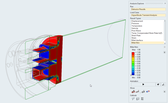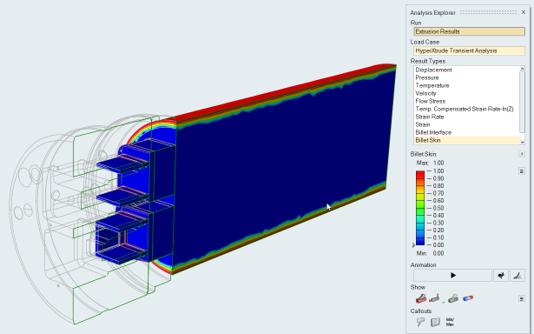 In Inspire Extrude, skin tracking analysis can be set up as a transient moving boundary analysis where the the movement of the dummy block and billet are simulated.