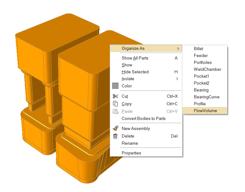 To simulate how aluminum deforms inside the die, we need to extract the volume created by the die surfaces that come in contact with the aluminum.