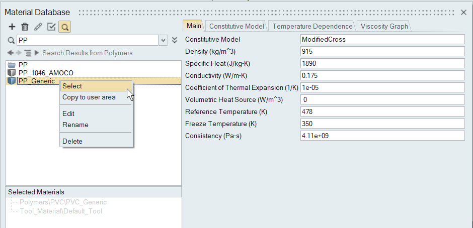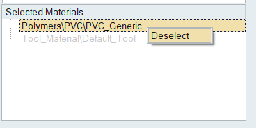 4. After the material is selected, verify the bottom material under Selected Materials and deselect the material that is not needed for this analysis, PVC_Generic.