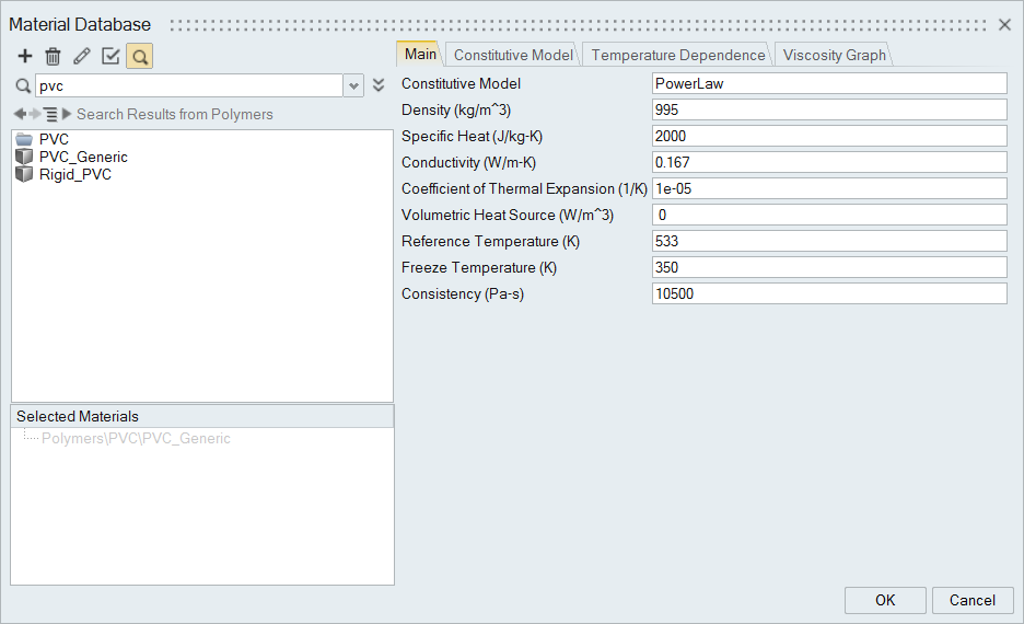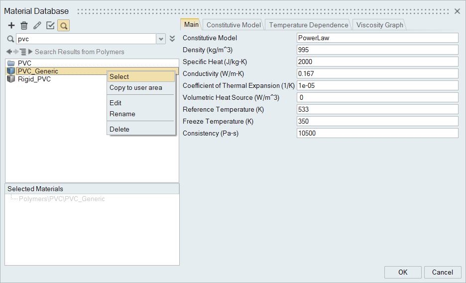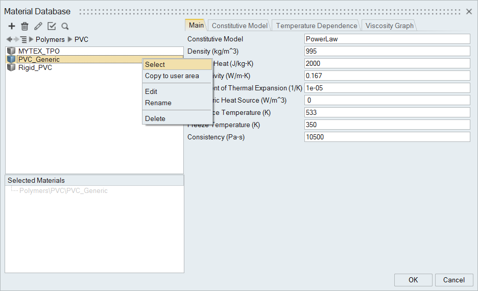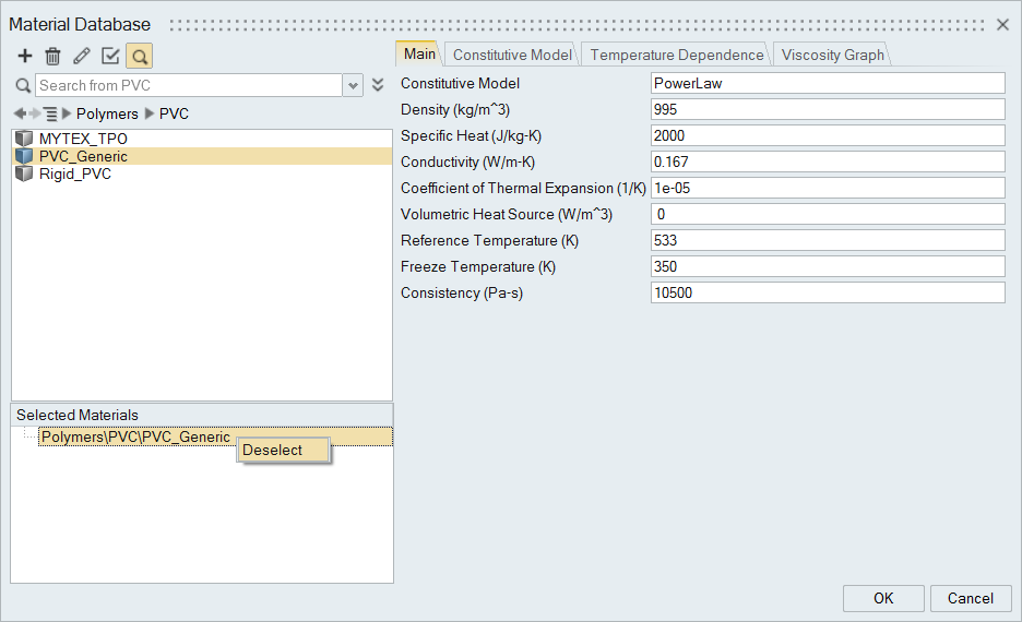 Note: You can deselect a material by right-clicking on a selected material and clicking Deselect. This is a single polymer extrusion die, so you only need one polymer for this simulation.