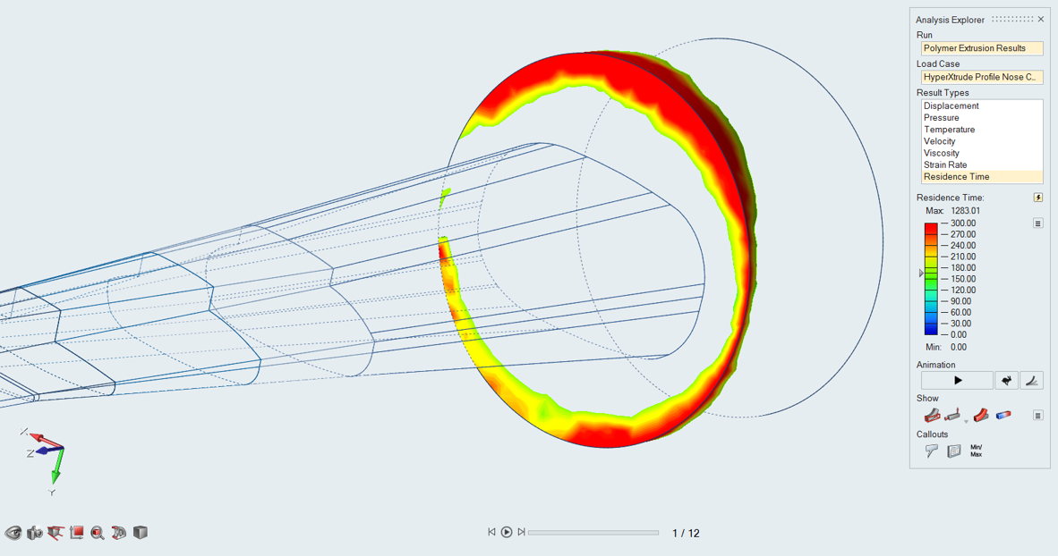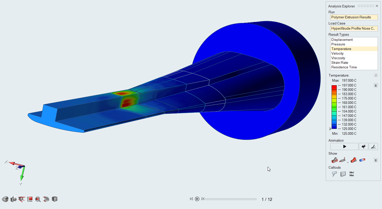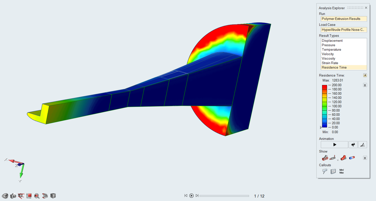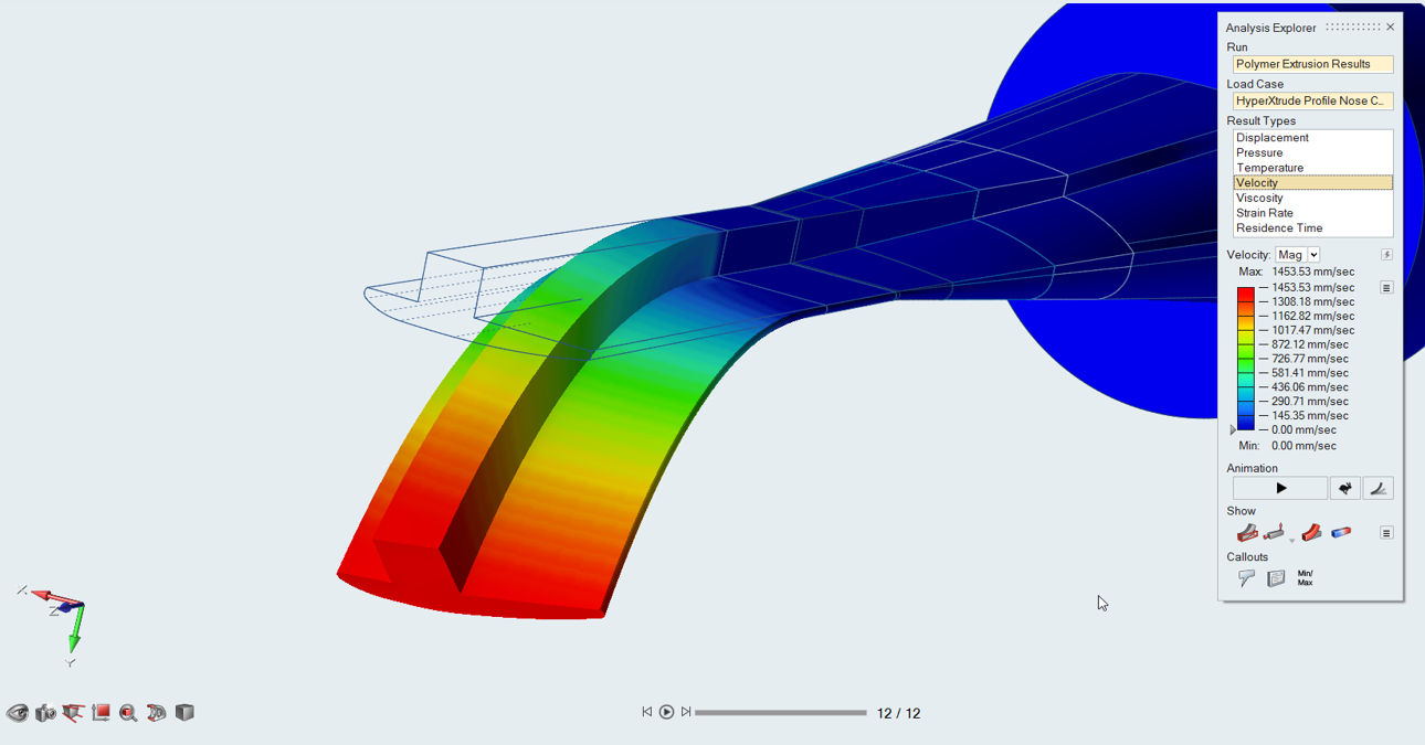 The Profile exit velocity in the extrusion direction must be significantly higher than the velocity in other directions. Velocities in directions other than the extrusion direction indicate the possibility of profile deflection. Velocities at the solid wall must be close to zero.