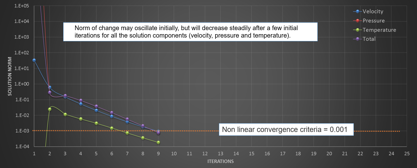 Check the Norm of Change in the Solution. The Norm of Change may oscillate initially, but it will decrease steadily after a few initial iteration for all of these solution components: Velocity, pressure, and temperature. The solution is considered 'converged' if the value of the Norm of Change in the Solution is less than the tolerance (0.001) for all of the variables. A slow convergence rate or oscillatory behavior indicates that the mesh is too coarse.