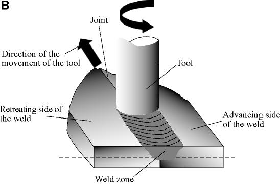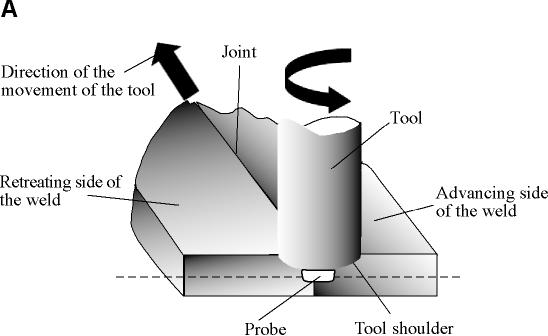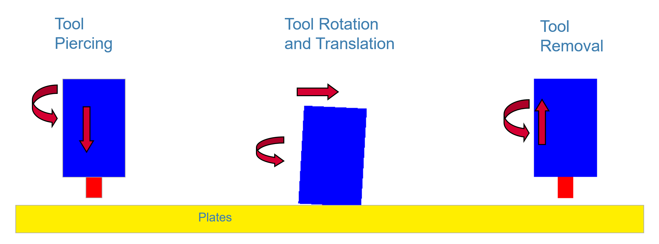These three stages make this a transient process. The rotating tool is initially plunged into the joint until the shoulder contacts the workpiece. This is called piercing. Then it traverses along the contact line where the two parts are being welded together. Finally, it is removed away from the plates and this stage is called withdrawal. The pin may be tilted at an angle and it can also be threaded. The frictional heat generated by the rotating pin softens the alloys of the welded plates and mixes them together through viscoplastic deformation. This welding happens much below the melting temperature of the alloy. For example, aluminum alloys melt around 625-650 deg C and the joining is achieved with the alloys in the range of 400-450 deg C.