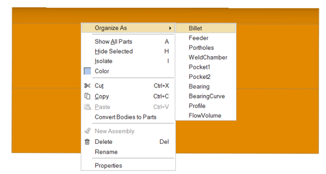 - ソリッドを、前にモデル化したとおり、Billet、Feeder、Portholes、Pocket1などとして、編成します。