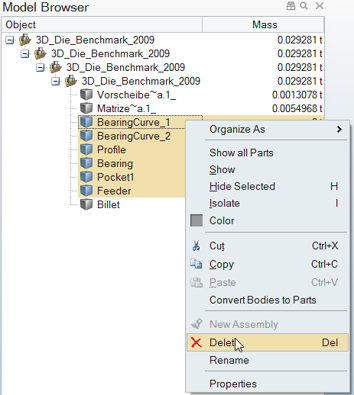 このモデルには、フィーダープレートとダイスプレートの2つのツールコンポーネントに加え、ツールたわみ解析には必要ない対象加工物コンポーネントが含まれています。これらのコンポーネントは、先に進む前に削除する必要があります。