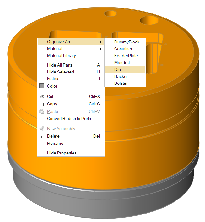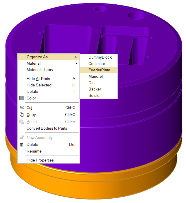 このモデルはフィーダープレートとダイスプレートの2つのツールコンポーネントで構成されており、これらを編成する必要があります。