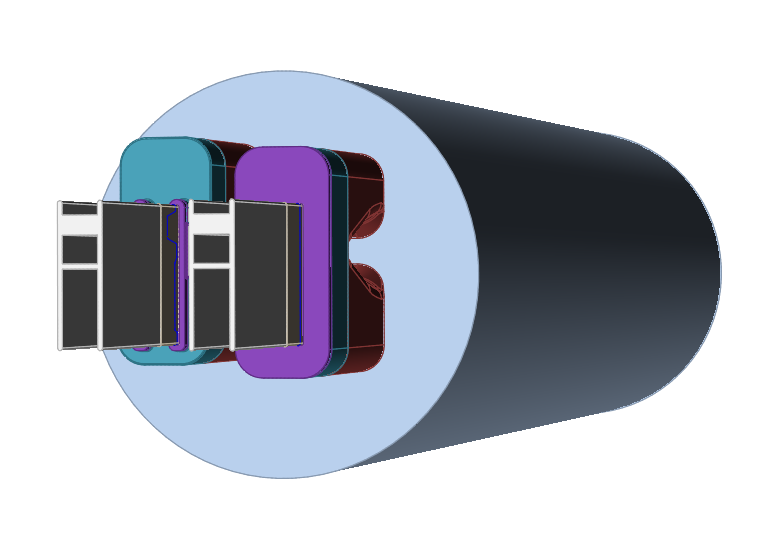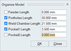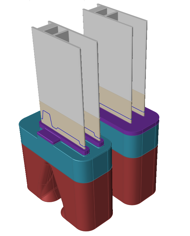 モデルにはマンドレルとダイスのキャップが含まれます。このダイスアセンブリを通して、2つの中空プロファイルが押し出されます。データファイルは、<インストールディレクトリ>\Altair\2022\InspireExtrudeMetal2022.1\tutorial_models\extrudemetal\tutorial-2 の下のtutorial_modelsフォルダーにあります。