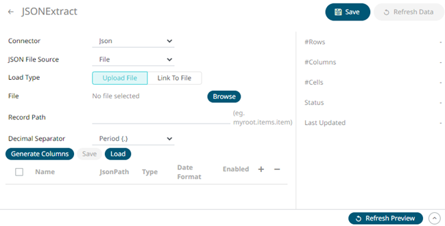 1. On the New Data Extract page, select JSON in the Connector drop-down list.