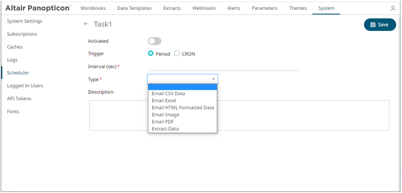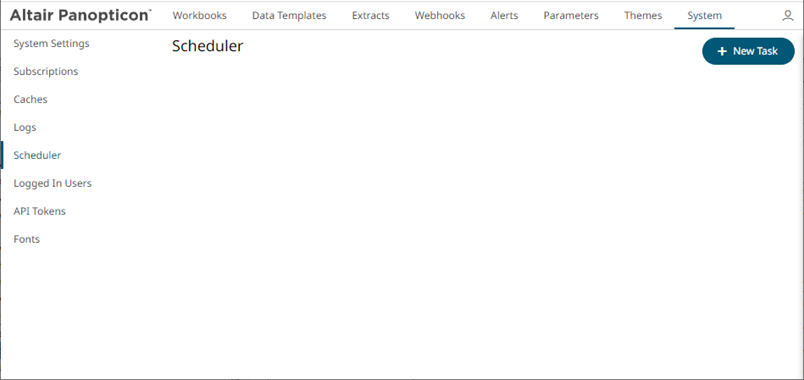 On the Scheduler tab of the System Settings page, Panopticon Real Time allows scheduling of tasks.