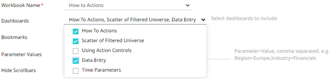 · Select the Workbook Name in the drop-down list. These are the published workbooks available on the Workbooks page.