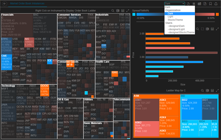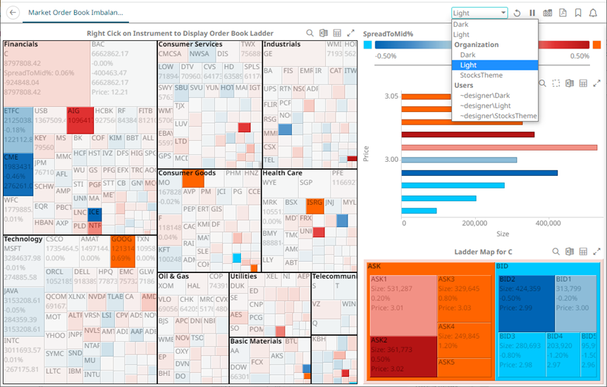 On an opened workbook, users can dynamically switch between the two provided default workbook themes: Light or Dark.