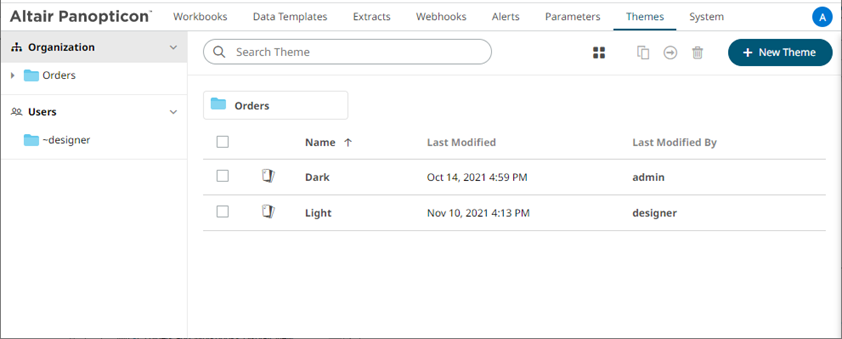 The Theme tab allows management of these workbook themes which are stored in the repository on the server.