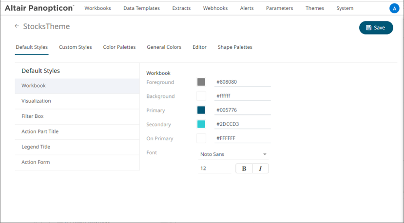 · Default Styles – Define the default style settings of the workbook, visualizations, filter box, action part title, legend title, and action form.