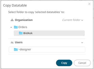 The Copy Datatable dialog displays with the folder or subfolders the user is allowed to copy the data template.