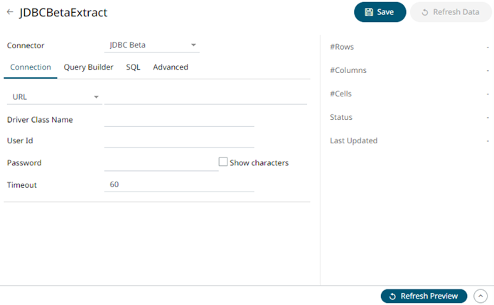 1. On the New Data Extract page, select JDBC Beta in the Connector drop-down list.