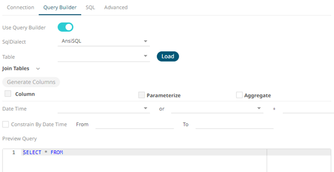 4. Query definition and execution can be done, using either the query builder or freeform SQL. To use the query builder, select the Query Builder tab. Otherwise, proceed to step 6.