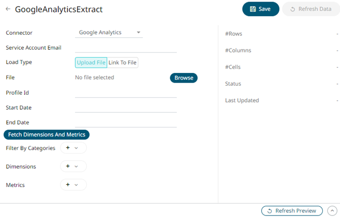 1. On the New Data Extract page, select Google Analytics in the Connector drop-down list.
