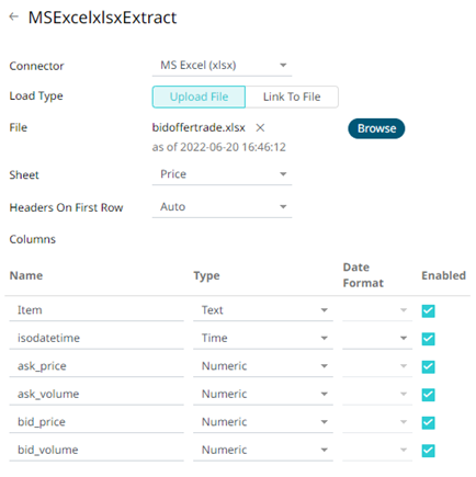 When a file is selected the MS Excel (xlsx) connector will automatically select the first available sheet, and populate available columns.