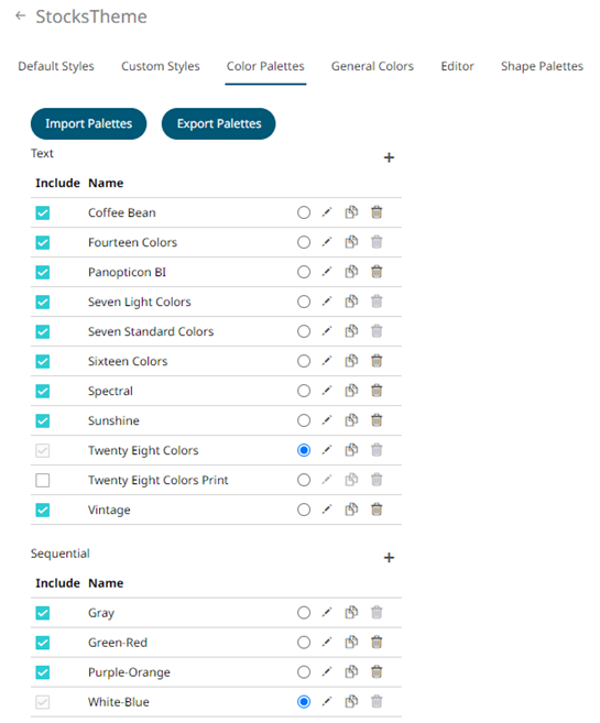When you define the settings of the color palettes, you can manage, import, or export Text, Sequential, and Diverging color palettes.