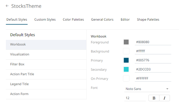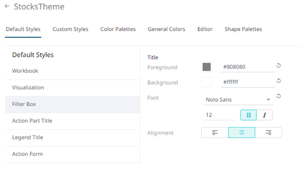 When you define the default settings of a theme, you specify the colors and fonts of the workbook, visualizations, filter box, action part title, legend title, and action form.