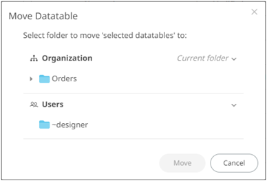 The Move Datatable dialog displays with the folder or subfolders the user is allowed to move the data template.