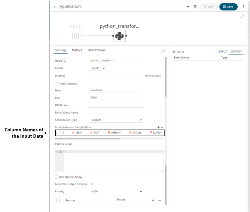 3. On the Input Schema/Sample Data section, the column names of the Input data source are displayed. You can opt to add sample data to ensure transform is applied in case the input database, files, or infrastructure becomes unavailable.