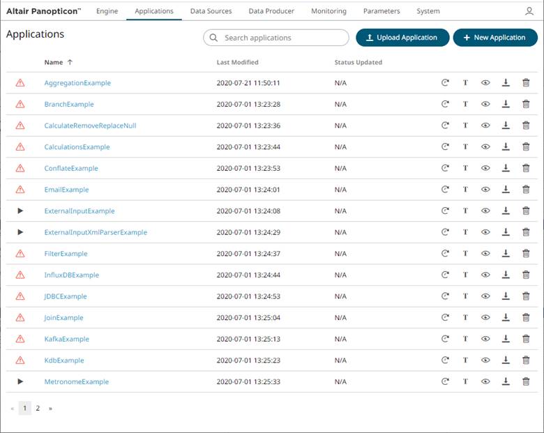 1. To execute an application, ensure the icon displays before the Name. This means the necessary data sources are already uploaded.