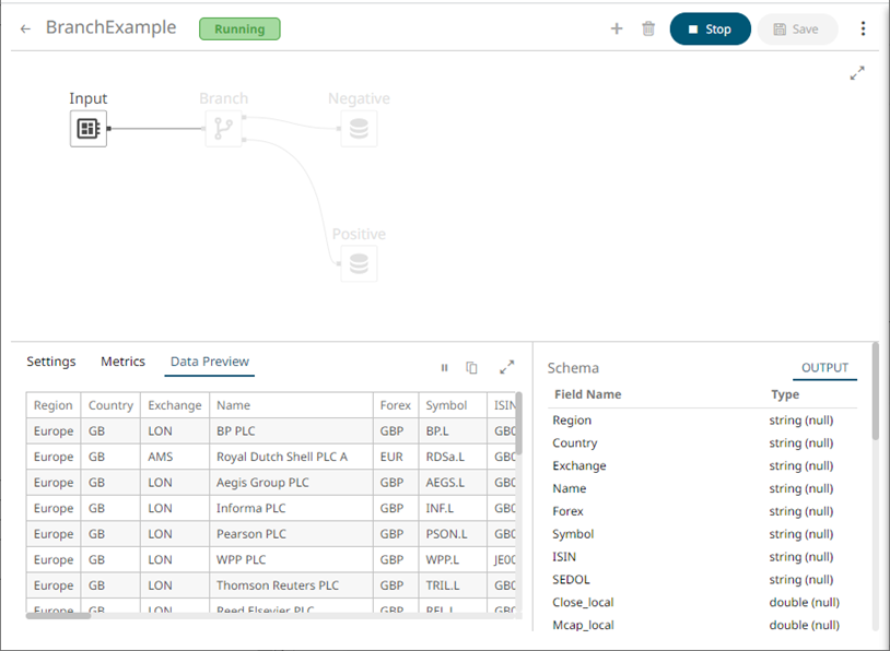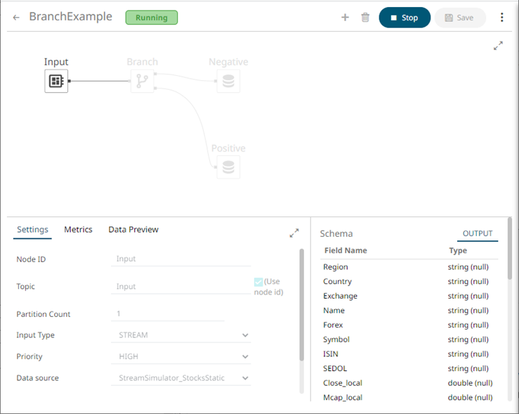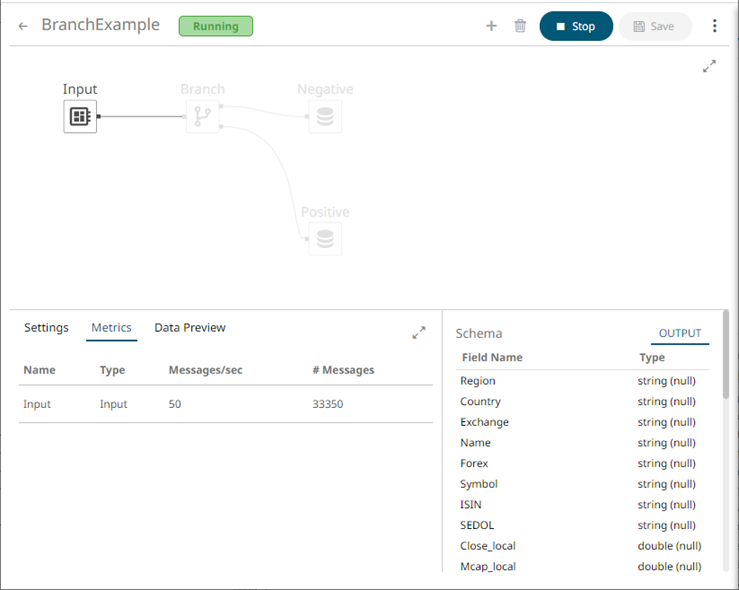 · click the Metrics tab to display the node’s Metrics as well as the preview of the data (OUTPUT) in the Schema panel