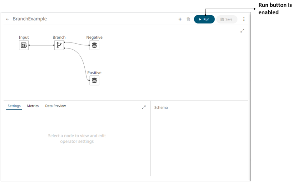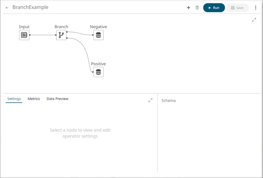 · click on a node in the Graph panel to display its Operator Settings as well as the preview of the data (OUTPUT) in the Schema panel