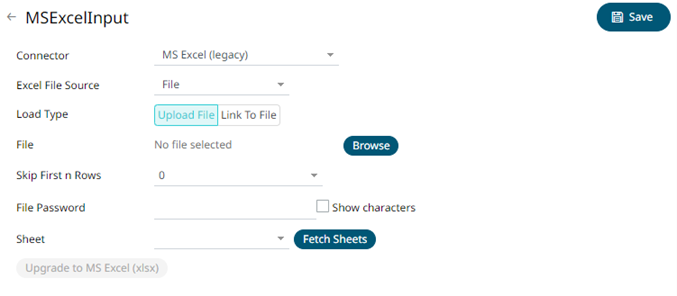 1.     In the New Data Source page, select Input > MS Excel (Legacy) in the Connector drop-down list.