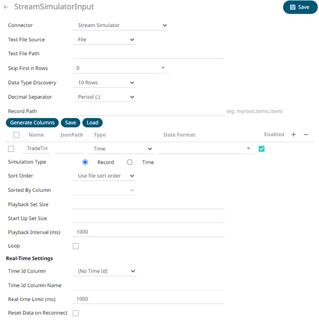 1. In the New Data Source page, select Input > Stream Simulator in the Connector drop-down list.