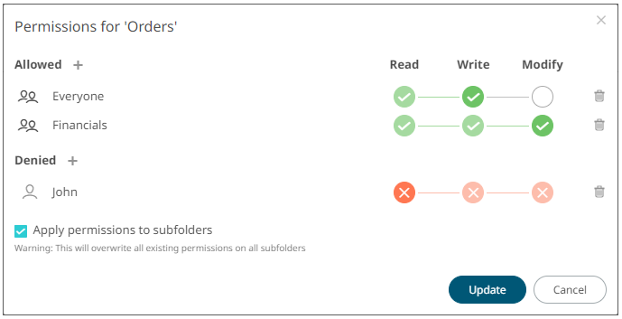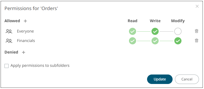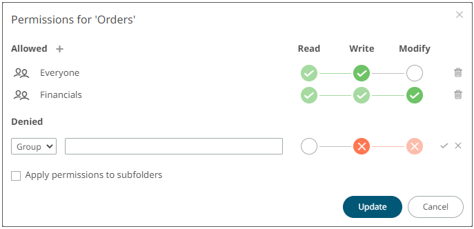 The Apply Permissions to Subfolders check box is only enabled when there is an existing subfolder.