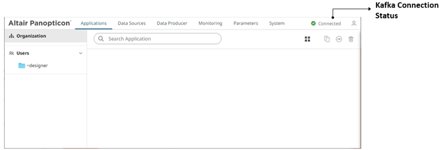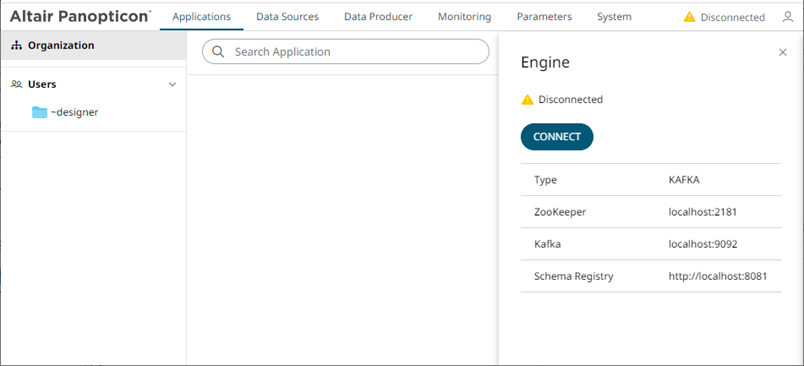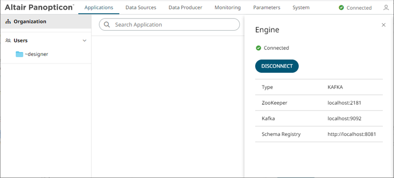 Displays whether Panopticon Streams is connected to or disconnected from the CEP Engine (Kafka). |