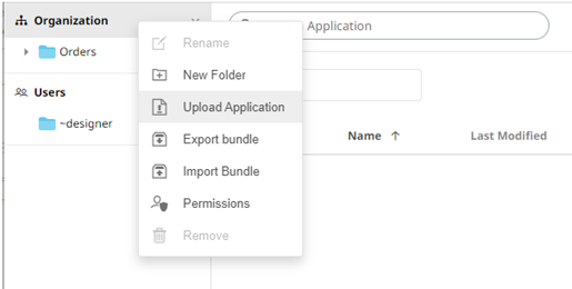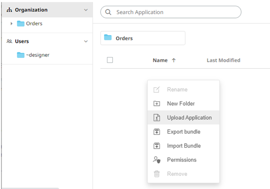 1. To upload applications, you can either right-click a folder or subfolder then select Upload Application: