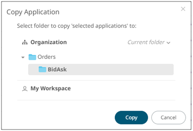 The Copy Application dialog displays with the folder or subfolders the user is allowed to copy the applications to.
