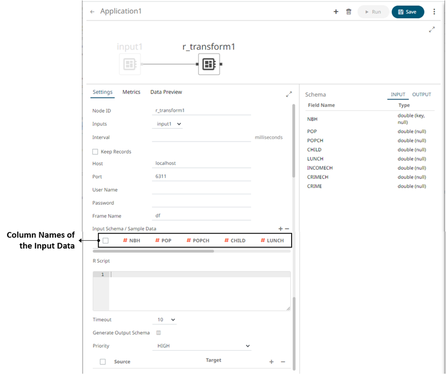The R script that reference the input frame name. Returns a data frame. |