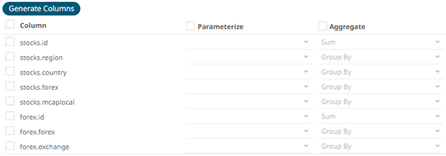 4.6. If the data returned is to be aggregated, then the Aggregate box should be checked. For each selected column, the possible aggregation methods are listed including: