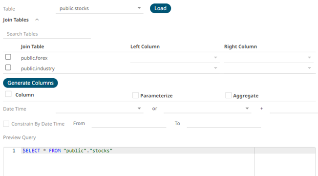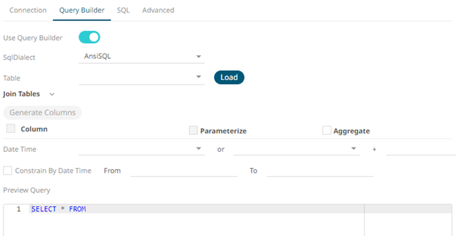 4. Query definition and execution can be done, using either the query builder or freeform SQL. To use the query builder, select the Query Builder tab. Otherwise, proceed to step 5.