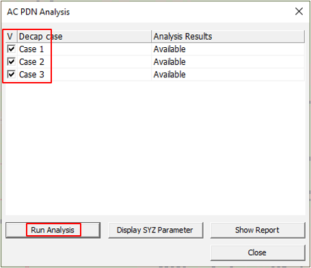 In the AC PDN Analysis dialog, select the Decap cases and