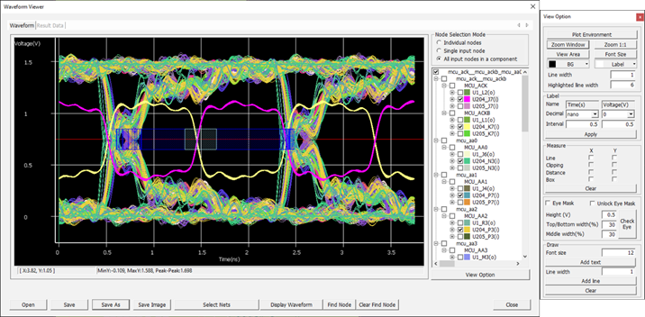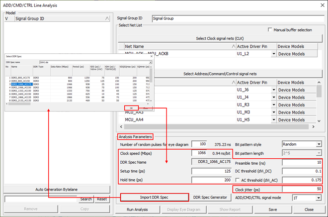 Use ADD/CMD/CTRL Line Analysis to analyze interconnect network of command and control group nets of DDR BUS in time domain to obtain the eye diagrams and transient waveforms which are different views of the signal delay and distortion.
