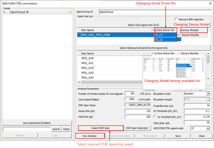 Creating a network analysis model starts with selecting clock net and CMD/CTRL net from the net listing. The net name is initially assigned to the model name. In case of CMD/CTRL group of DDR BUS, CPU component can only be selected for CMD/CTRL analysis using Active Driver Pin button.