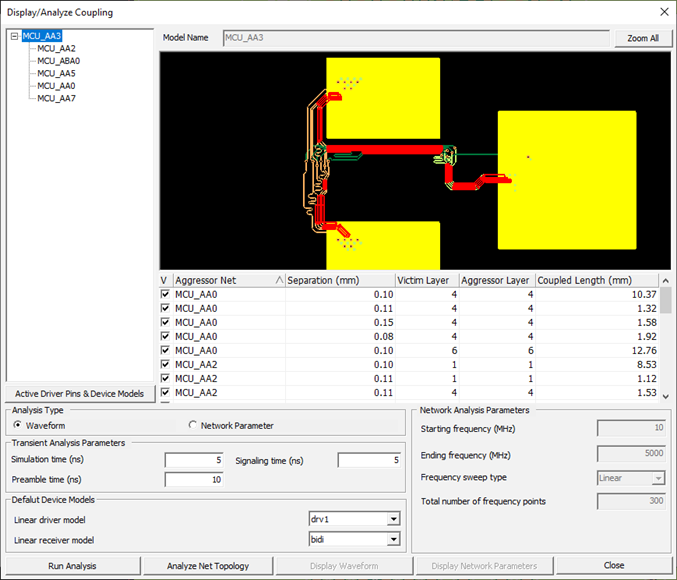From the menu bar, click to execute waveform and network parameter analysis for the selected net(s) considering the coupling effects by neighboring nets. When you specify the victim net, the strongly coupled nets are automatically screened through whole PCB layers. The coupling parasitic will be extracted and configured as SPICE circuit for the crosstalk analysis.