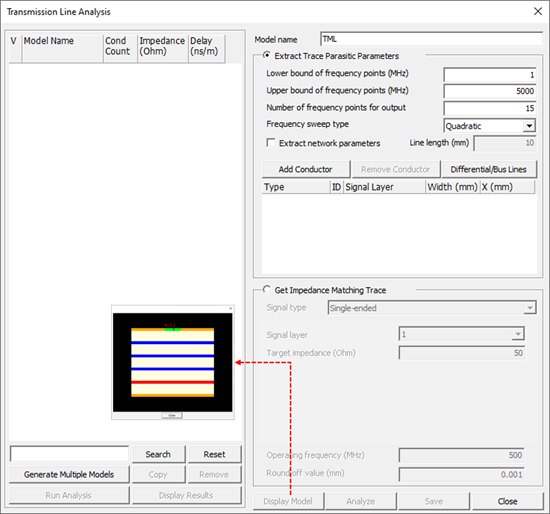 For extracting frequency-dependent parasitic parameters of the model, users can change the analysis control parameters such as lower and upper bounds of frequency points, number of frequency points for output, and frequency sweep type. Add Conductor menu is used to add conductor or ground traces to the model. For each trace (conductor), users need to select the conductor type (Conductor or Ground) and signal layer and define the conductor width and location. Display Model menu is used to graphically display the transmission line model.