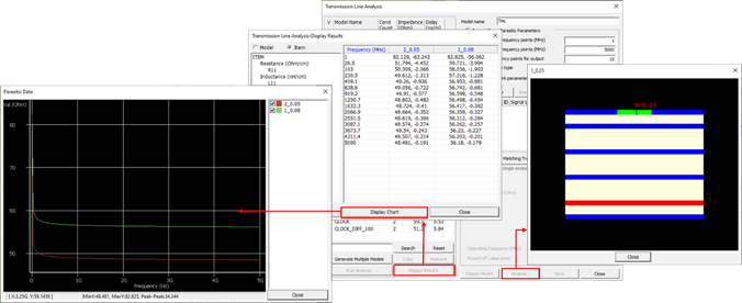 Traces used for routing nets are modeled as transmission lines. Transmission Line Analysis menu is used to run transmission line analysis to extract parasitic parameters and line characteristics of single and multi-conductor trace models or to find impedance matching trace configurations to minimize the signal integrity problems. A built-in full-wave electromagnetic field solver is employed for the transmission line analysis. This function can be effectively used at a pre-design stage for optimizing the board layer stack-up and determining the trace widths to use for routing nets.