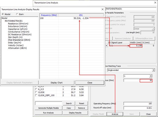 Upon selecting the Analyze menu, the impedance matching transmission line model is automatically found by iteratively running the electromagnetic field solver. Then the analysis results at the operating frequency point are displayed. Upon completion of the analysis, the analysis type is automatically switched to Extract Trace Parasitic Parameters for the impedance matching transmission line model. The model can be graphically viewed in Display Model menu.