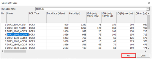- DDR Spec: The setup time of input signal is automatically filled if user use Import DDR Spec. You can modify each parameter.