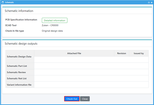 Click Check Out to download the schematic design. For new projects, no data is downloaded when you first check out. Once a schematic design is checked in, download the data on the server.
