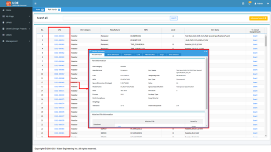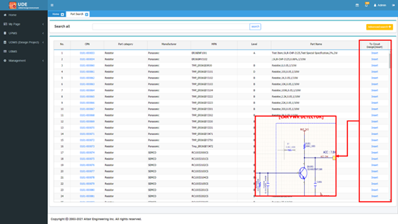 - Using the Insert function, you can add (place) the selected part to a Schematic ECAD drawing directly. (This function is available according to the CAD tool.)