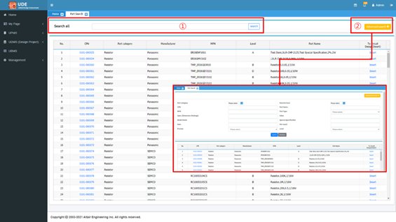 - Detailed search finds parts that satisfy all entry values entered with the ‘And’ condition.